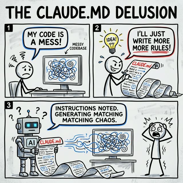 It doesn't work. The AI is reading your codebase, and your codebase has a vibe. A messy codebase vibrates at a frequency of messiness. The AI will pattern-match to that frequency no matter what your instruction file says. It will produce code that "fits," and fitting into a mess means producing more mess.